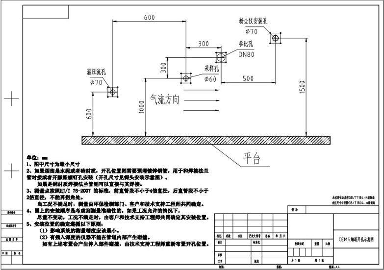 煙氣在線監測系統在煙囪上的開孔位置大概在:煙囪直徑的4倍處(變徑之上),根據煙囪氣流的方向,從左往右開孔依次是:溫壓流孔、氣體采樣孔、環保參比孔、粉塵(顆粒物)取樣孔、濕度孔5個取樣孔。孔徑的大小:溫壓流孔70mm/采樣孔60mm/參比孔80mm/粉塵孔70mm。