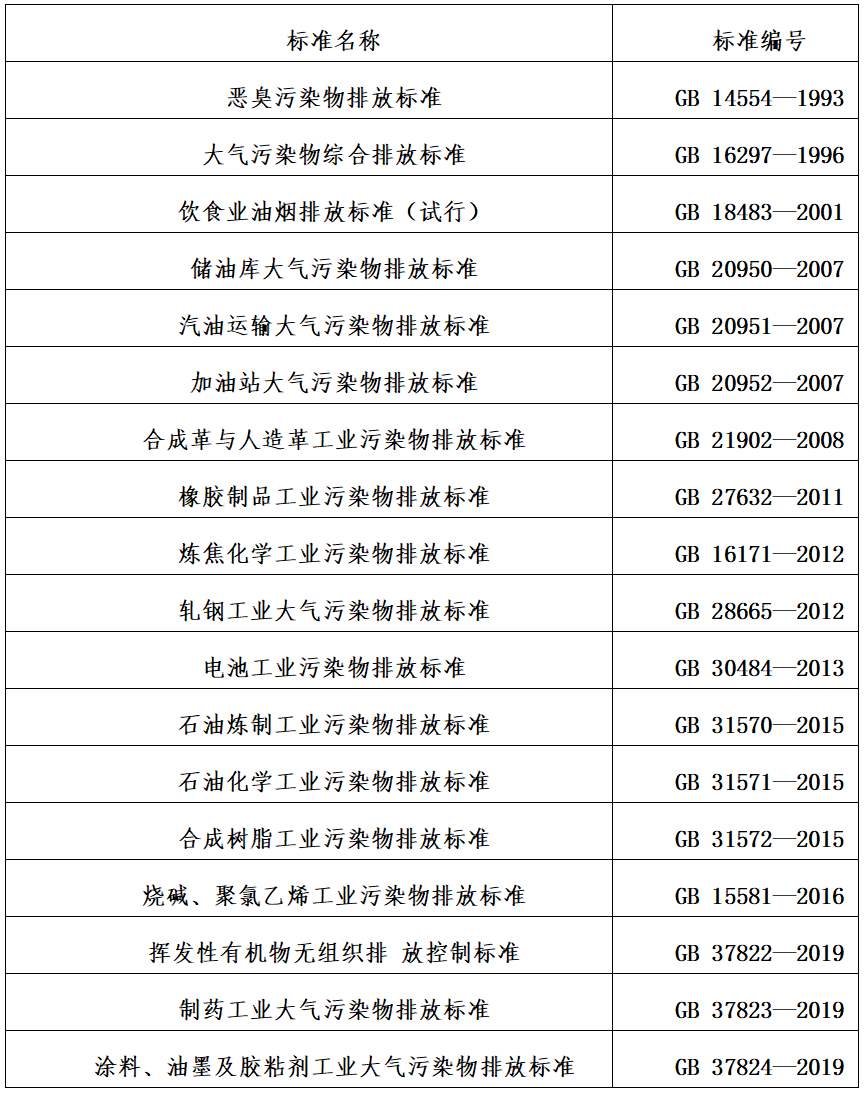 共18項涉及VOCs國家大氣污染物排放標準(截至 2019 年 11 月