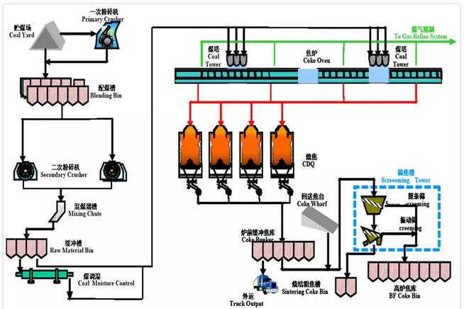 煉焦的目的是生產(chǎn)質(zhì)優(yōu)、價廉的冶金焦炭。煉焦同時還能產(chǎn)生焦?fàn)t煤氣還能作為燃料。煉焦生產(chǎn)單元一般包括配煤、煤處理、焦?fàn)t燃燒、焦?fàn)t出爐、熄焦、焦處理等工序。主要原料有:煉焦煤、軟瀝青等。大致工藝流程如下: