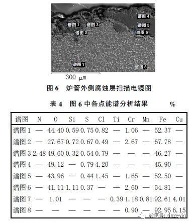 對爐管外側(cè)腐蝕層進(jìn)行了掃描電鏡和能譜分析,結(jié)果見圖6 和表4。由表4 可知,腐蝕層中O 含量從外到內(nèi)逐漸變低;S 元素也大致呈現(xiàn)類似規(guī)律,但其含量較低,質(zhì)量分?jǐn)?shù)在0.37%~0.79%;此外,腐蝕層外側(cè)還發(fā)現(xiàn)了Cl 元素,但腐蝕層內(nèi)側(cè)未發(fā)現(xiàn)Cl 元素。結(jié)果表明,爐管外側(cè)主要發(fā)生了氧化腐蝕,還存在一定程度的硫腐蝕和氯腐蝕。