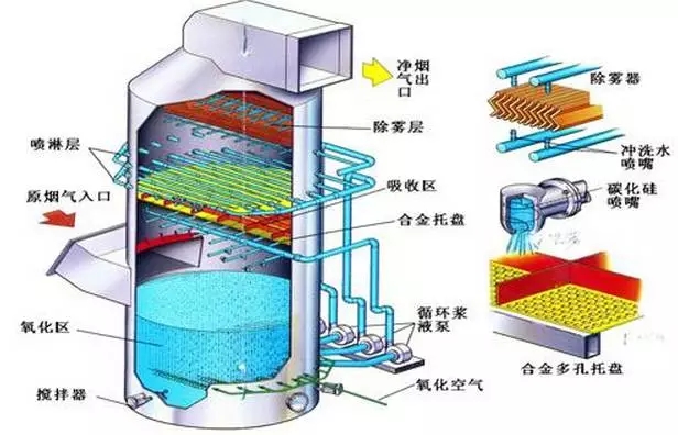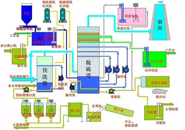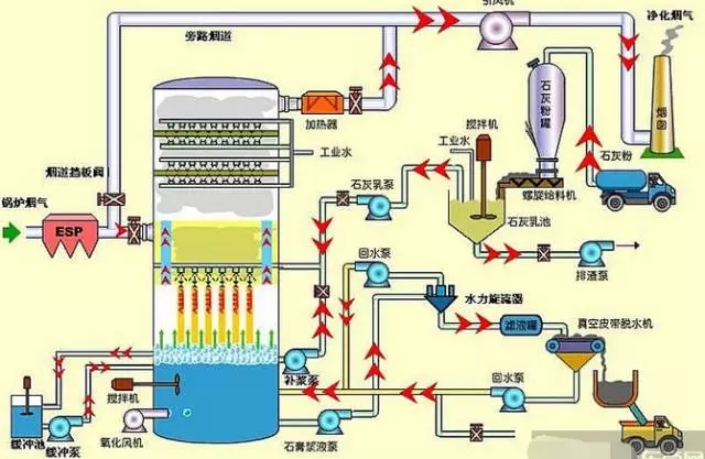 石灰石(石灰)石膏脫硫系統(tǒng)包括煙氣換熱系統(tǒng)、吸收塔脫硫系統(tǒng)、脫硫漿液制備系統(tǒng)、亞硫酸鈣氧化系統(tǒng)、石膏脫水系統(tǒng)等幾部分;該工藝是目前世界上最成熟應(yīng)用最廣泛的技術(shù)。