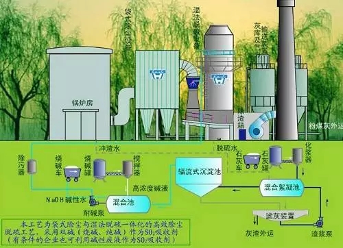 由于在吸收和吸收液處理中,使用了兩種不同類型的堿,故稱為雙堿法。雙堿法包括了鈉鈣、鎂鈣、鈣鈣等各種不同的雙堿工藝。鈉鈣雙堿法是較為常用的脫硫方法之一,成功應(yīng)用于電站和工業(yè)鍋爐。