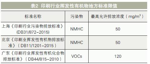 塑料軟包裝印刷企業(yè)產(chǎn)生的廢氣量較大,大部分企業(yè)VOCs濃度在5000ppm以下,屬中低濃度,其中烘干廢氣的溫度通常在50~80℃,VOCs年排放總量大。目前國內對于印刷行業(yè)VOCs排放執(zhí)行的標準主要為地方標準,具體見表2。南京地區(qū)主要參照的是上海市《印刷行業(yè)污染物排放標準》(DB31/872-2015)。