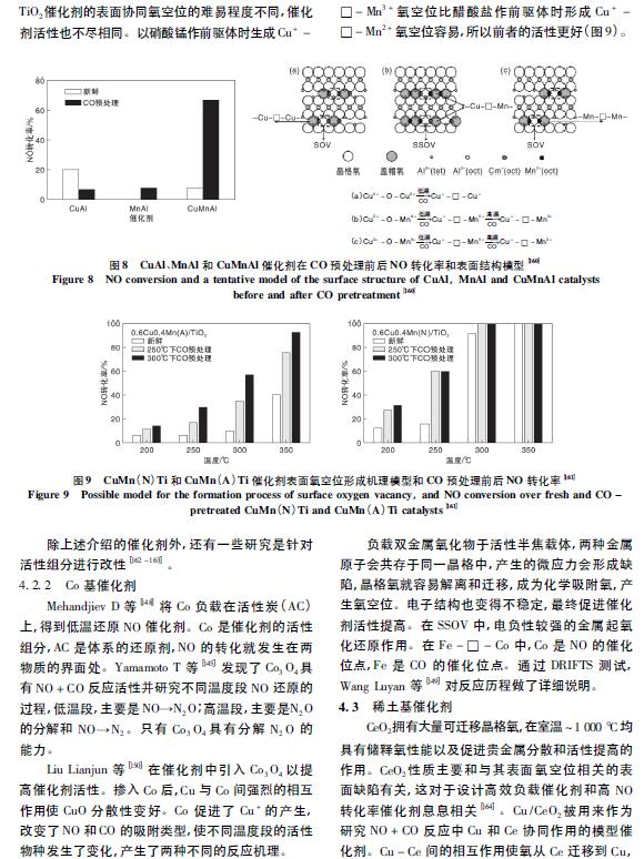 在CeTi 催化劑中,Ce 和Ti 在原子級別上的相互作用產(chǎn)生的Ce - O - Ti 有助于提高催化劑活性。Li Ping 等[75]用FETEM 直接觀察到Ce - O - Ti 結(jié)構(gòu),無定型Ce0. 3 TiO∞在( 175 ~ 400) ℃ 時的NO 轉(zhuǎn)化率為90%。此外,利用XANES 和原位FTIR 等證明了表面高度分散的Ce - O - Ti 結(jié)構(gòu)是反應(yīng)的活性中心。Chen Lei 等 利用溶膠- 凝膠法合成CuCeTi 催化劑,在( 150 ~ 250) ℃時的NO 轉(zhuǎn)化率大于80%,Cu 提供的L 酸位點(diǎn)成為反應(yīng)的活性中心,加速了低溫段快速SCR 反應(yīng)過程。在此基礎(chǔ)上進(jìn)行改進(jìn)( 圖5) ,在Ce - Ti 催化劑中摻雜了少量Cu2 + ,可以顯著提高催化劑的低溫SCR 活性。研究表明,Cu 與Ce 物質(zhì)的量比0. 005 時,( 200 ~400) ℃的NO 轉(zhuǎn)化率為80%,N2選擇性為100%。Cu - O - Ce 的形成促進(jìn)了Ce4 + 向Ce3 + 的轉(zhuǎn)化,增加了表面活性氧。分散態(tài)Cu 增加了Ce -Ti 催化劑表面酸性,提高了NH3吸附能力,從而加速了反應(yīng)向E - R 機(jī)理方向進(jìn)行。在Ce - Ti 催化劑中摻雜W 可以在Ce - W 間產(chǎn)生強(qiáng)烈的相互作用,產(chǎn)生更多的Ce3 +、NOx 和NH3吸附物種,從而提高催化劑活性。Fu Mengfan 等發(fā)現(xiàn),采用共浸漬法時,在( 200 ~ 400) ℃ 的NO 轉(zhuǎn)化率大于90%。利用均相沉淀法進(jìn)一步提高了Ce -W - Ti 催化劑在高空速下的活性,在Ce 與W 物質(zhì)的量比1∶ 1、空速500 000 h - 1和溫度( 275 ~ 400) ℃條件下,NO 轉(zhuǎn)化率為90%。W 的引入促進(jìn)了活性Ce 的分散,增加了催化劑表面活性CeO2晶體、氧空位和酸位。在低溫段( < 300 ℃) ,W 促進(jìn)了NO 向NO2的氧化,在高溫段( > 300 ℃) ,W 提高了N2選擇性。