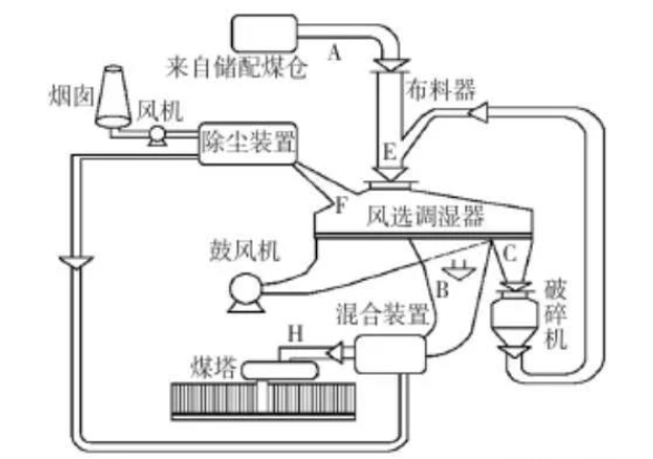 風動選擇煤調濕工藝特點:該裝置位于備煤車間粉碎機前,具備風選功能,<3mm的煤料直接送往煤塔,其中的大顆粒、重質顆粒進入粉碎機進行粉碎,粉碎后的煤再進行風選,形成閉路循環,裝爐煤中不存在大顆粒、重質顆粒,水分降至6%~7%,不僅實現了入爐煤的風動選擇粉碎,而且實現了對入爐煤水分的調濕;布袋除塵器濾出的煤粉,壓成型煤入爐煉焦。