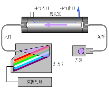 煙氣分析儀是基于紫外吸收光譜分析技術和紫外差分算法(DOAS)的氣體分析儀器。光源發出的光束匯聚進入光纖,通過光纖傳輸到外置的高溫測量室,穿過氣體室時被待測氣體吸收后,由光纖傳輸到光譜儀,在光譜儀內部經過光柵分光,由陣列傳感器將分光后的光信號轉換為電信號,獲得氣體的連續吸收光譜信息。儀器根據此光譜信息采用差分吸收光譜算法(DOAS),得到被測氣體的濃度。